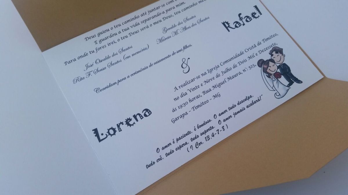 Lindo Convite Com abertura nas duas pontas em diagonal mostrando o nome dos noivos