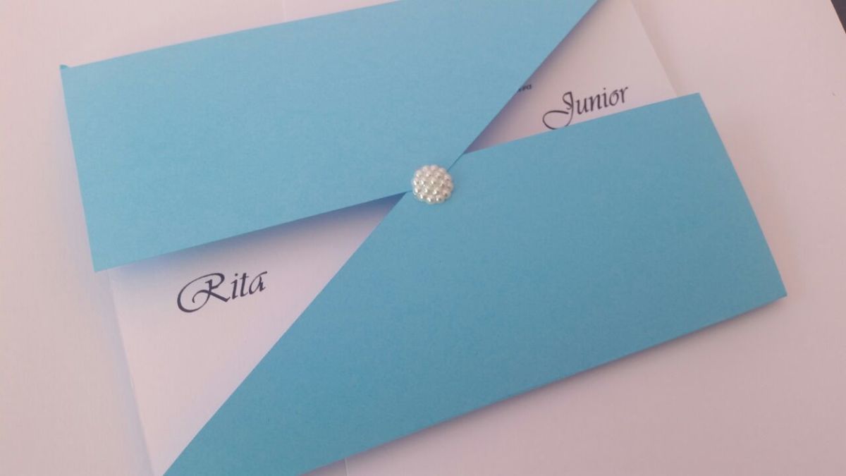 Convite Confeccionado em Papel Palha, Amarelo, Kraft, Azul Claro, na Gramatura de 240 gramas.